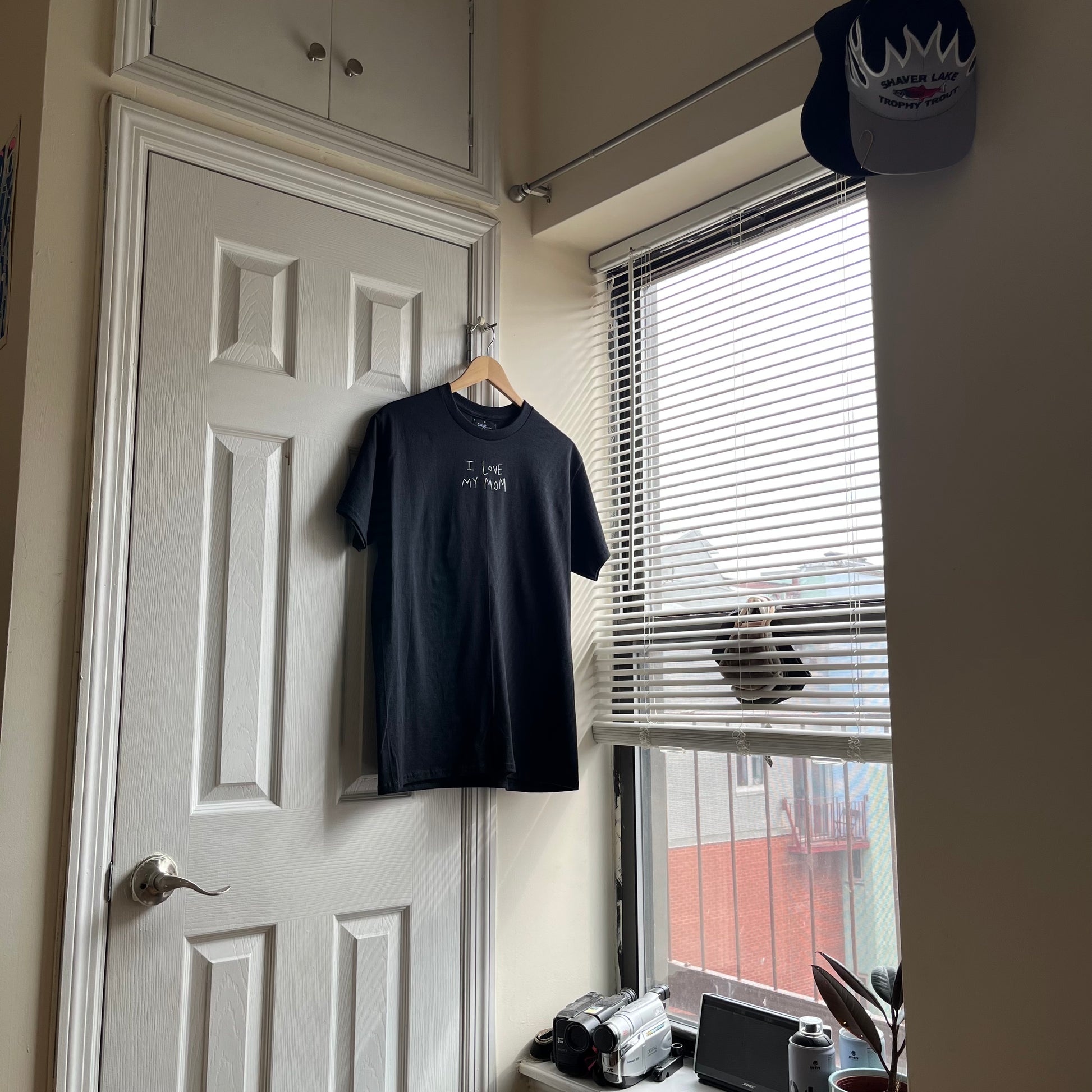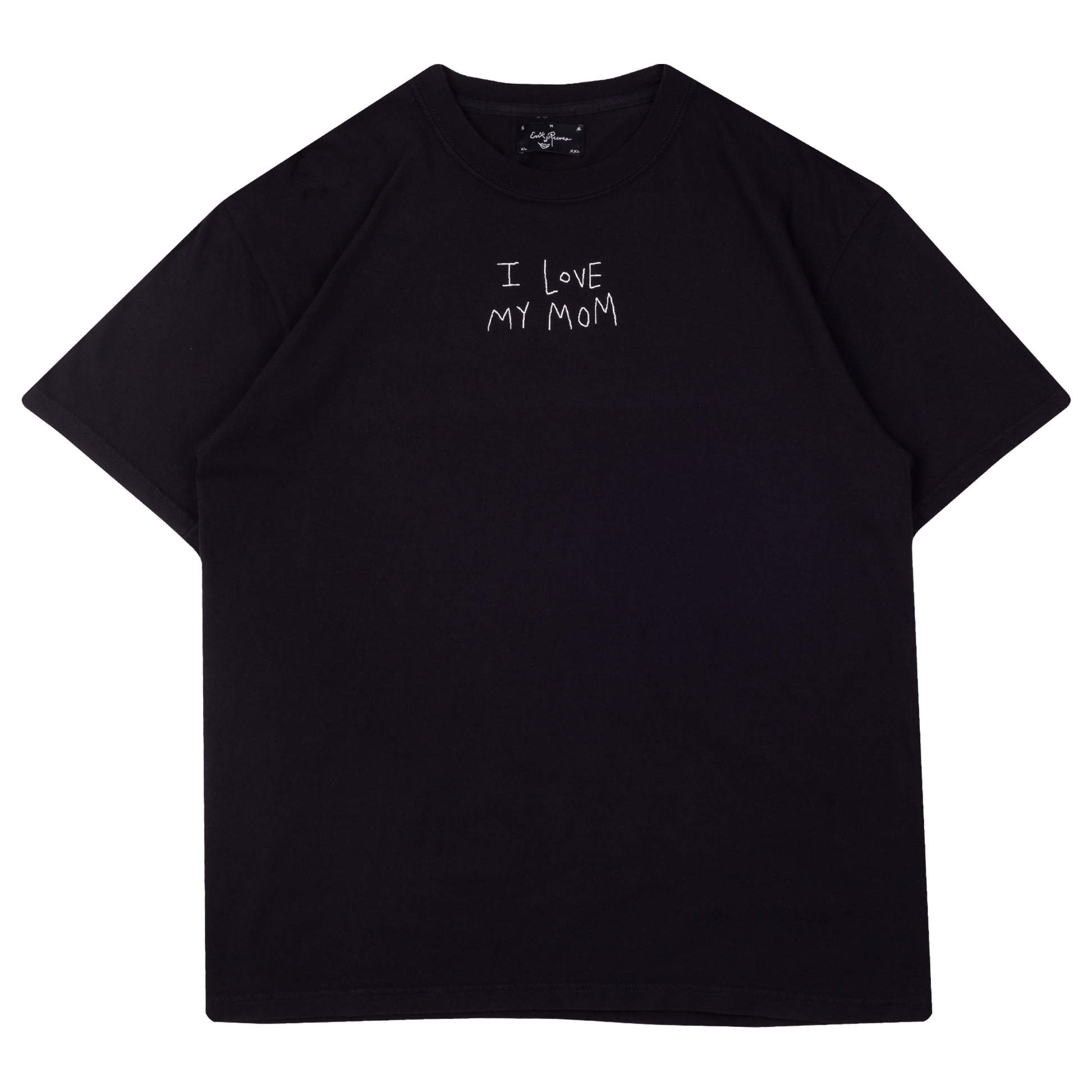 White puff print on black t-shirt. Wash cold, hang dry.